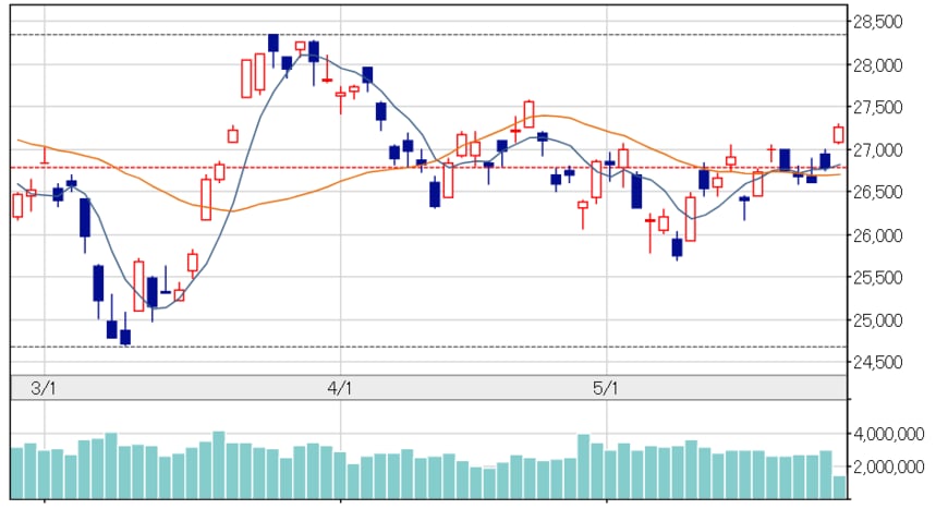 2022年5月27日の東京株式市場で、日経平均株価の終値は、前日比176円84銭高の2万6781円68銭でした。4日ぶりの反発です。