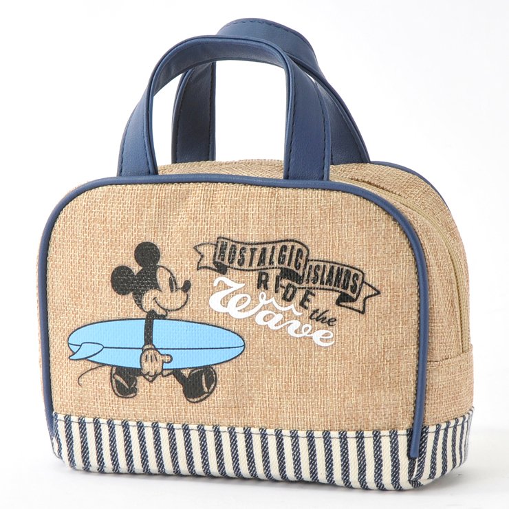 落ち着いたデザインの持ち手つきポーチです。101匹わんちゃんが元気に走り回っているものと、サーフボードを抱えたミッキーが描かれているものの2種があります。