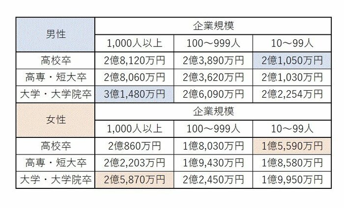 たとえば大学・大学院卒の男性の場合、企業規模「1000人以上」では3億1480万円に対して、「10~99人」では2億2254万円と、生涯賃金に9200万円以上の開きが見られます。