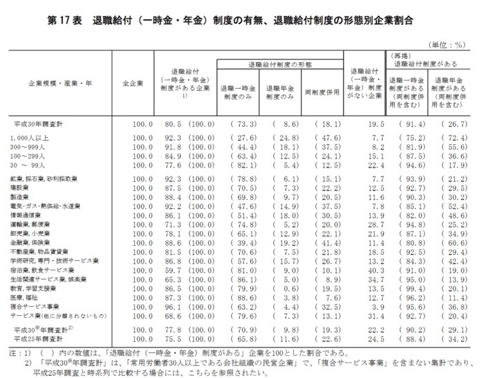厚生労働省の「平成30年就労条件総合調査」の退職給付(一時金・年金)制度によると、「退職給付(一時金・年金)制度がある」企業の割合は80.5%。