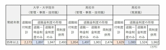 「大学・大学院卒(管理・事務・技術職)」では、「退職一時金制度のみ」が1897万円、「退職年金制度のみ」が1947万円、「両制度併用」が2493万円。