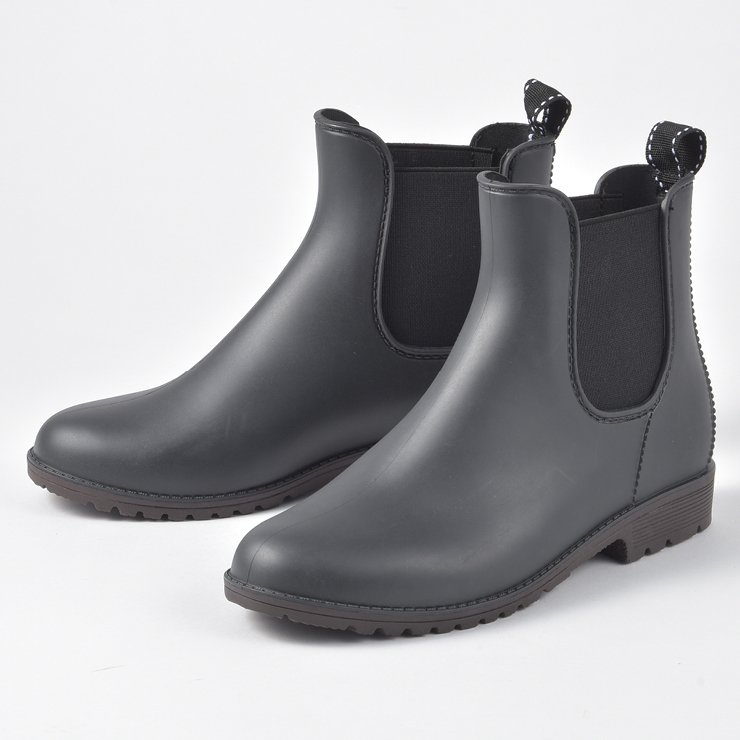 トレンドのサイドゴアデザインのレインブーツです。サイズは、MからLLまであって、1,790円(税込 1,969円)。カラーは画像のブラックのみです。