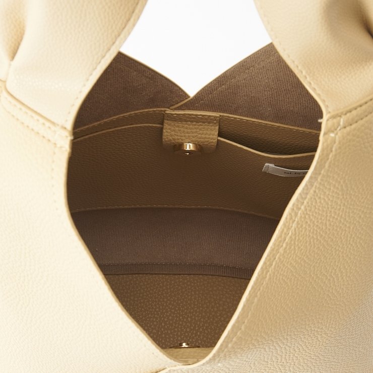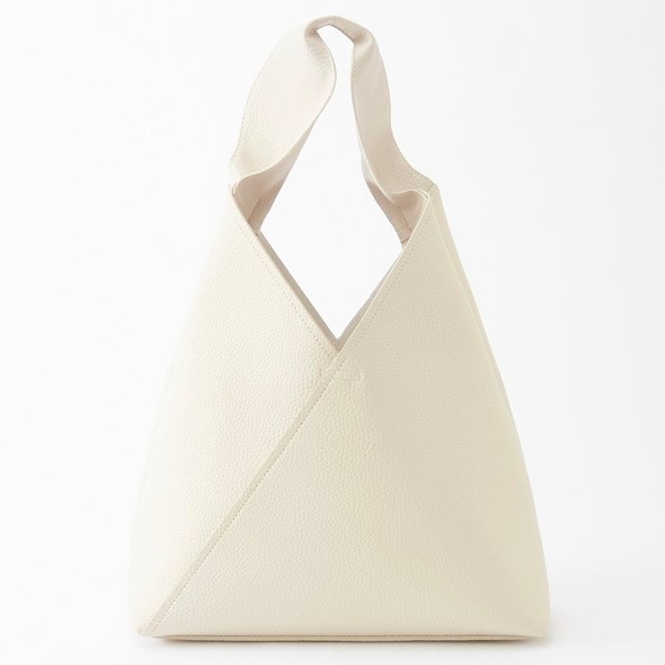 V字型にカッティングされたデザインが印象的なトートバッグです! カラーは、画像のオフホワイトの他に、ブラックとベージュもあります。