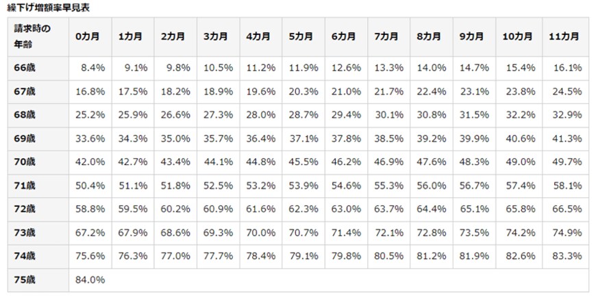 2022年4月からは、繰下げ受給の可能年齢が75歳まで拡大されました。これにより、増額率は次のようにひろがりました。