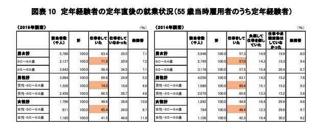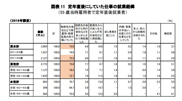 定年直後に仕事をしていた人にその就業経緯を尋ねた結果をみると、73.9%が勤務先の会社などでの再雇用・勤務延長によるものであり、2014年調査と比較すると8ポイント程度上昇しています。