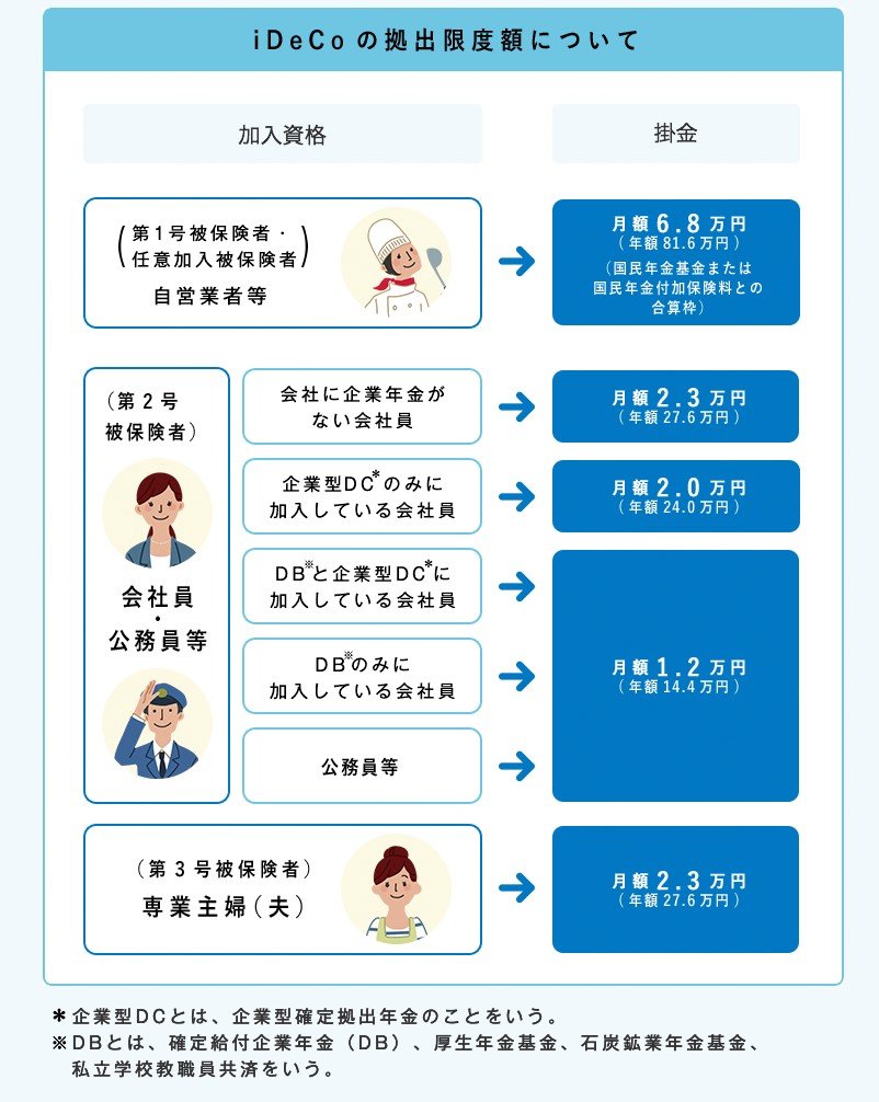 - 拠出限度額:加入区分に応じて1.2万円~6.8万円