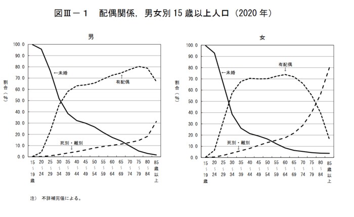 初婚年齢の平均は男女ともに30歳前後ですが、2020年の国勢調査では既婚の割合が未婚の割合を上回るのは男性で35~39歳以上、女性で30~34歳以上ともなっています。
