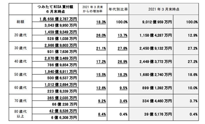 金融庁によれば、つみたてのNISAの買付額で2021年3月末~6月末の増加率で最も伸びたのは「20代(26.0%)」「30代(21.1%)」「40代(17.2%)」。