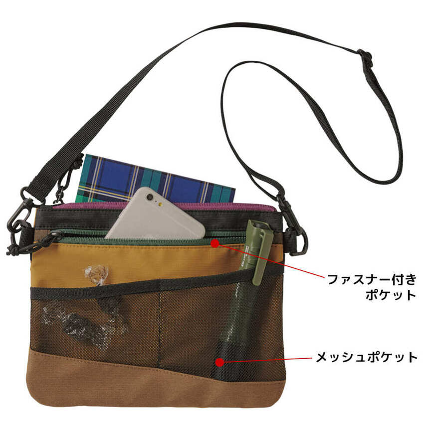 生地には撥水加工がされていて、サコッシュにしては生地が分厚くて高見えします。ただし、Dカン取り付け部がやや脆い印象があります。実際、重たいものを入れるとDカン取り付け部がちぎれた! との声も。しかし、手ぶら用のポーチとして使う分にはまったく問題がないでしょう。