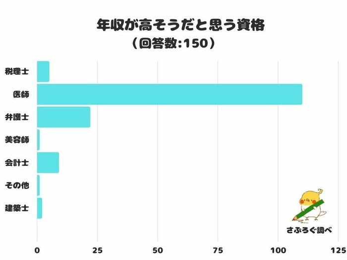 年収が高そうだと思う資格をアンケートにて調査したところ、1位は「医師」でした。