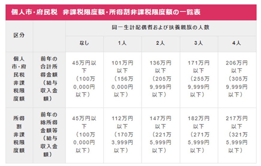 あくまでも東京23区の場合ですが、前年の「合計所得金額」が45万円以下であれば非課税となることがわかりました。