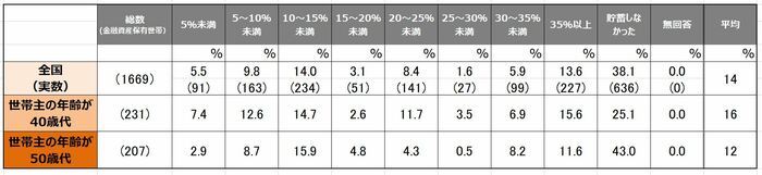 40代で最も多かったのは「35%以上:15.6%」ついで「10~15%未満:14.7%」、「5~10%未満:12.6%」「20~25%未満:11.7%」(貯蓄しなかったを除く)の順でした。