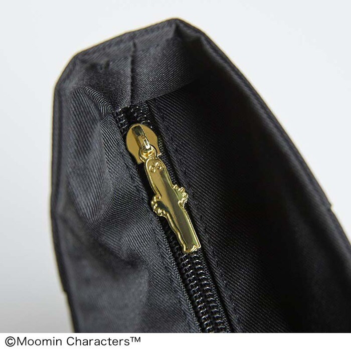シンプルで使いやすいブラックベースに、リトルミイ・ムーミン・スノークのおじょうさんが並んだカラフルなイラストが入ったフロントポケット付きです。引き手はニョロニョロ型で、細かいところまでかわいいポイントが盛り込まれています。
