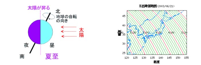 夏至の場合、北極側が太陽の方を向くので緯度が高ければ高いほど日の出が早くなり、日没は遅くなります。たとえば札幌と東京なら、夏至には札幌のほうが少し早く日の出となります。北極付近では日が沈まないため白夜となるのですね。