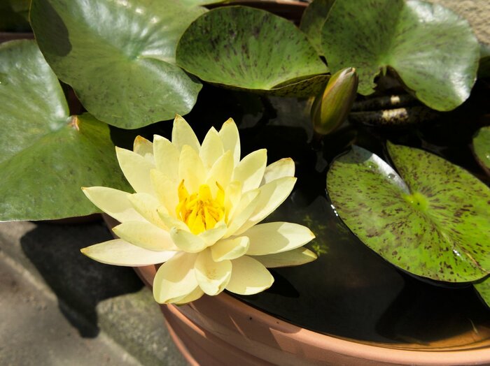 睡蓮鉢は、置き場所に合わせた色を選び、できれは断熱性に優れた陶器製がオススメです。直径40センチ、高さ15センチ以上の大きさの鉢だと、水質が安定します。