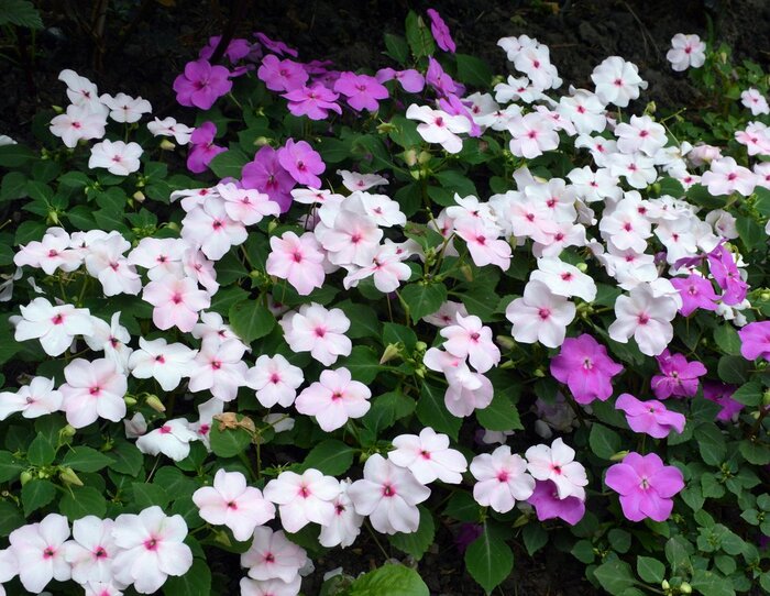 日陰でも豪華な花を咲かせるインパチェンスは、梅雨の時期も開花する一年草。秋まで長く花が咲くため、アジサイの生育時期とも重なります。