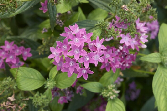 星型の可愛らしい花を咲かせるペンタス。草丈の低い矮性種のペンタスは、アジサイの株元に植えて、彩りを添えることができます。