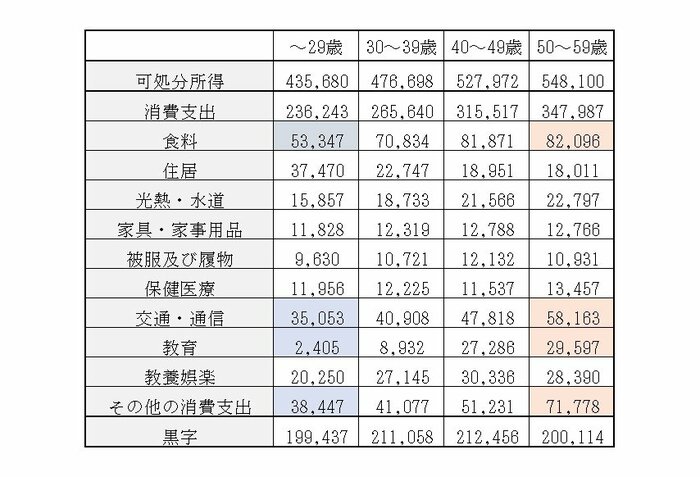 消費支出は「20歳代23万6243円、30歳代26万5640、40歳代31万5517円、50歳代34万7987円」と、年齢が上がるにつれて増加しています。大きく金額が異なる「食費」「交通・通信費」「教育費」「その他の消費支出」の項目を見ていきましょう。