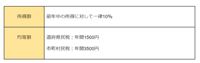 「所得割」の税率は、所得に対して一律10%となっており、前年の1月1日から12月31日までの所得で算定されます。「均等割」は、通常5000円(道府県民税1500円、市町村民税3500円)と定められています。