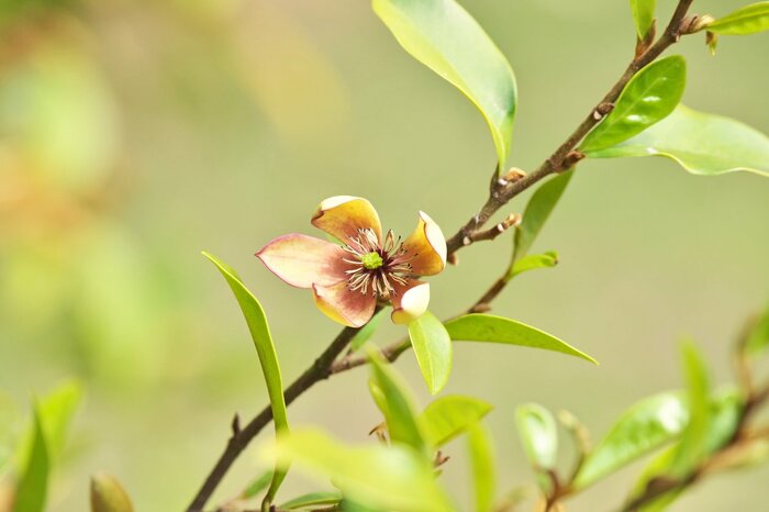 4~6月頃に、バナナの香りがする花を咲かせるカラタネオガタマ。樹高4~5メートルの常緑高木です。花は白くモクレンにも似ていますが、花びらが厚いのが特徴です。