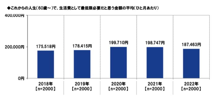 同調査より、これからの人生(60歳~)で必要だと思う金額について聞いたところ、まず「生活費として最低限必要だと思う金額」は平均で月18万7463円でした。
