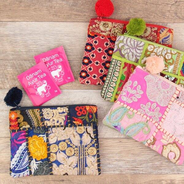 「カンバディア」は、インドの伝統的な手刺繍が施されたパッチワークのこと。ビーズなどの装飾がある色とりどりの古布を職人が丁寧につなぎ合わせて作られています。