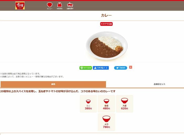 公式ホームページのメニューによると、すき家のカレーは「20種類以上のスパイスを使用し、玉ねぎやトマトの甘味が溶け込んだ、コクのある味わいのカレー」とのこと。