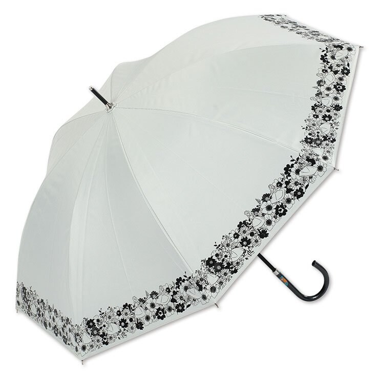 白地に、アリスのシルエットが黒でプリントされた日傘です。