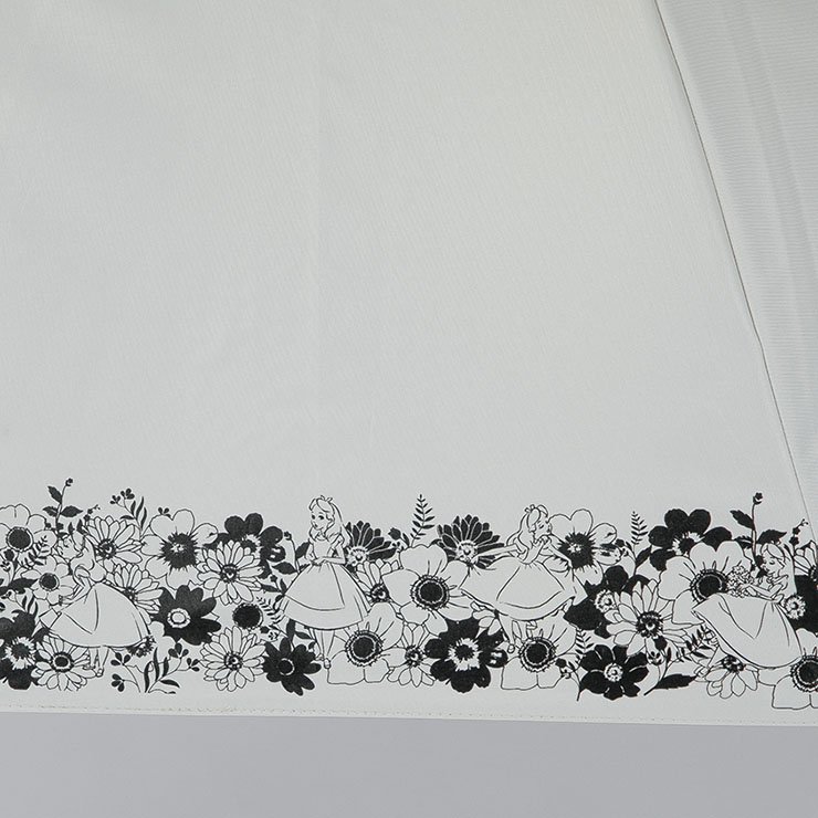 遠目からは、黒のレースプリントが施されたゴシックテイストな傘に見えます。しかし、近づいて見ると、花と戯れるアリスがプリントされていることがわかります。