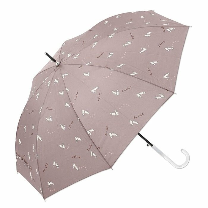 爽やかなクリア手元に猫と肉球のモチーフを掛け合わせた、可愛くお洒落な雨傘。UVカット90%以上で雨の日も紫外線ケアができ、ワンプッシュで開く便利なジャンプ傘。カラーはブラウンとグレーの2色。サイズは、全長:89㎝、親骨の長さ:60㎝、直径:103㎝となっています。ストライプ柄もあります。