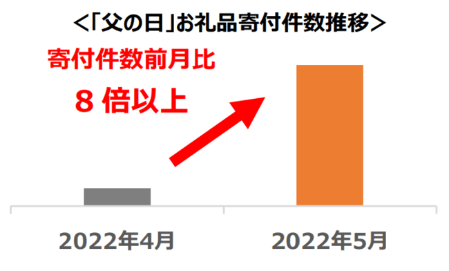 株式会社さとふるの調査によると、名称に「父の日」が含まれるお礼品の5月寄付件数は、前月比で8.0倍以上に増加。 ※2022年4月1日~4月30日および、2022年5月1日~5月23日までの期間で比較