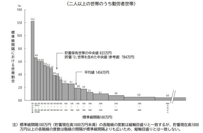 貯蓄の平均は1454万円、中央値は833万円と下がります。貯蓄を多く保有しているのは高齢者世帯が多いためでしょう。