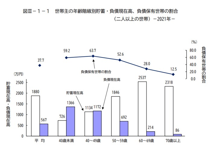 貯蓄現在高は「40歳未満は726万円、40代は1134万円、50代は1846万円」でした。貯蓄と負債の関係をみると、貯蓄が負債を超えるのは50代以降です。