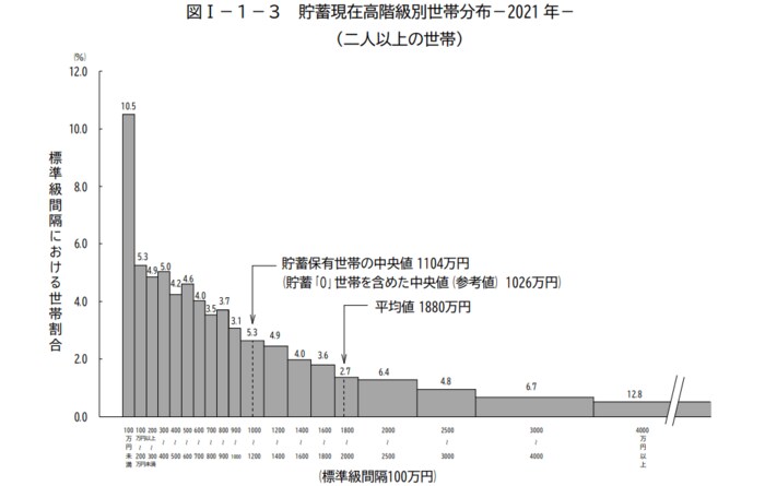 貯蓄現在高の平均値は1880万円で、平均を下回る世帯が67.6%と約3分の2を占めています。ただ平均は一部の富裕層の影響を受けるため、より実態に近い中央値をみると1104万円です。