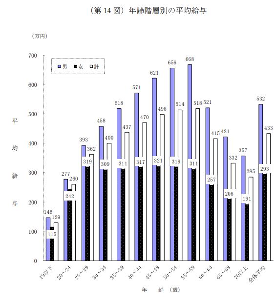 20代から50代にかけて上昇傾向にあるものの、ピークは50代後半の518万円です。男女別では男性が50代後半で668万円に到達しますが、女性ではピークが45~49歳の321万円。どの年代でも年収400万円を超えないという厳しい現実がわかりました。