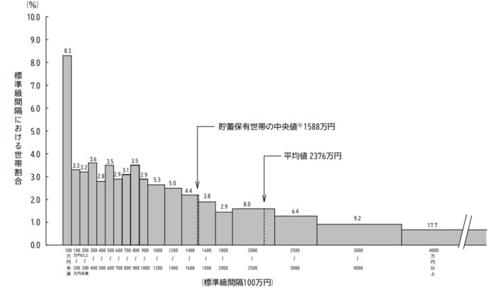 なお、貯蓄保有世帯の中央値は1588万円、平均値は2376万円です。