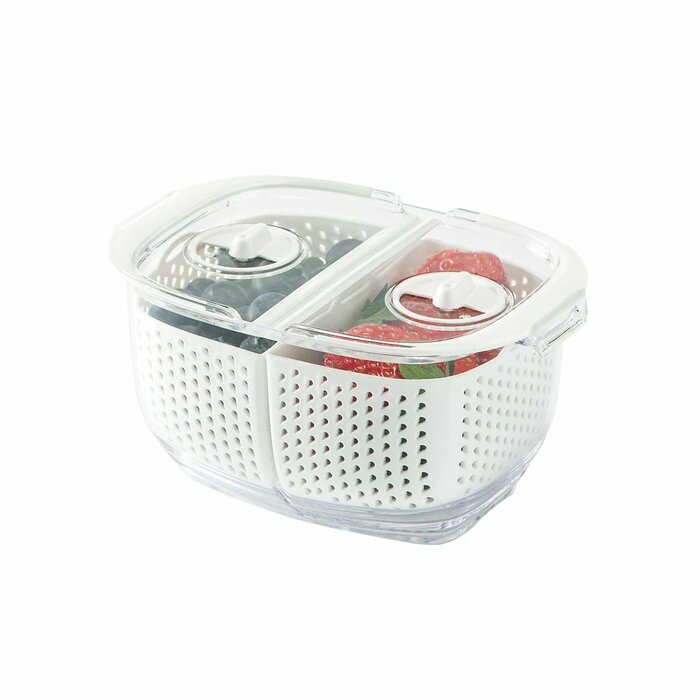 野菜や果物を洗って容器に入れておくだけで、サラダや果物がさっと食卓に並べられる優れもの。中に仕切りがあるので、2種類の食材を保存できます。