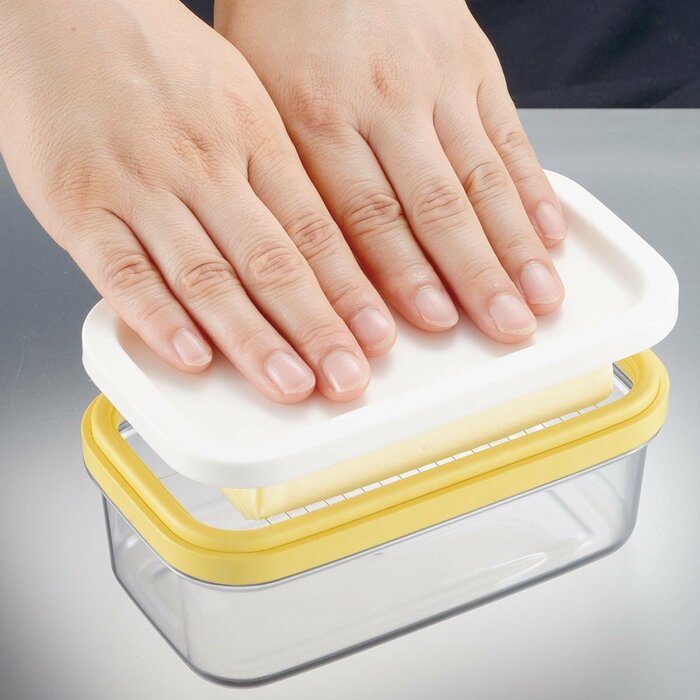 ワイヤーの上にバターを置いたら、ふたでぐっと押すだけで、簡単にバターがカットできる商品。カットされたバターは、そのまま容器に保存可能です。