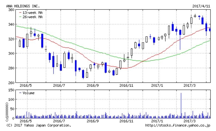 ANAの株価は2016年8月より多少の上下はありながらも上昇を続け、2017年3月にいったん天井をつける形で下落しています。そして現在は、その下落の途中と見えなくもありません。現在の下落が押し目をつけに行っているのか、それとも本格下落の初動となるのかは分かりません。