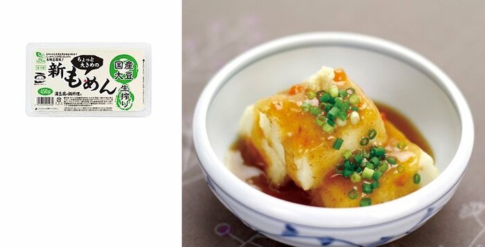 国内自社関連工場で製造している、国産大豆を使用した木綿豆腐風の豆腐です。にがりを使用しているので、しっかりとした食感に仕上がっています。