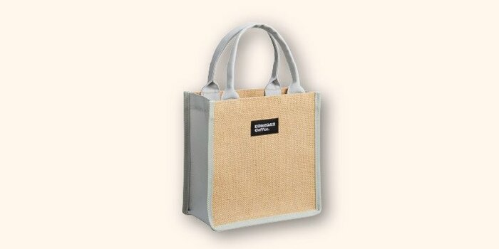 コーヒー豆を入れる麻袋をイメージしたバッグです。粗目のジュートを使用。ジュートは通気性が良いので、夏にぴったりですね。形状が崩れにくくしっかりしているので、重みに強いのも特長です。今回のバッグはマチが12cmと広めで、コンパクトな見た目なのにたくさん入ります。シンプルなデザインなので、お好きなバンダナやチャームをつけて自分だけのオリジナルバッグを楽しんでください。