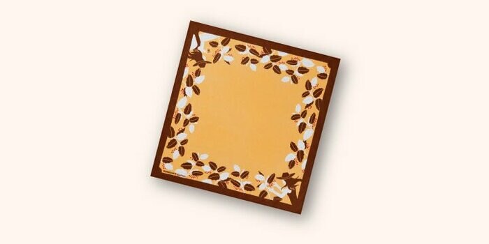 綿100%の大判バンダナです。グラスセットと同じく、コーヒー豆の収穫の様子が描かれています。クリーム色と茶色でデザインされていて、華やかながらも普段使いしやすい色合いが特徴です。バッグに巻いてアクセントにしたり、お弁当を包んだり、頭に巻いてもよさそうですね。暑い日には冷たい水に浸して首に巻くと、熱中症対策にも。