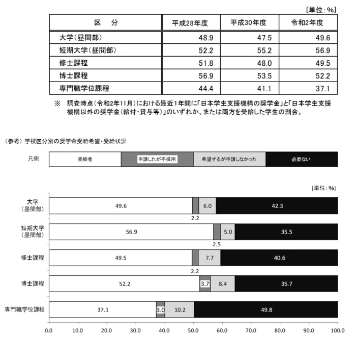 日本学生支援機構の「令和2年度 学生生活調査」によると、奨学金を受給している学生の割合は「大学(昼間部)が49.6%、短大56.9%」となっています。
