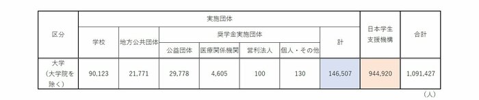 日本学生支援機構の奨学金制度も含めた奨学金制度を利用している大学生の数は109万1427人。そのうちの大半は日本学生支援機構(94万4920人)が占めていますが、14万6507人の大学生はその他の奨学金制度を利用しています。