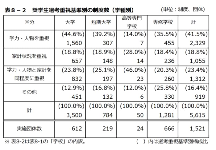 次いで「学力・人物と家計を同程度に重視」する制度が23.8%、「家計状況を重視」する制度は18.8%と、6割以上の制度において、家計状況より人物・学力に重点を置いた選考になっています。