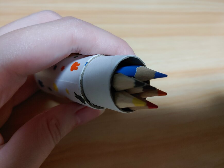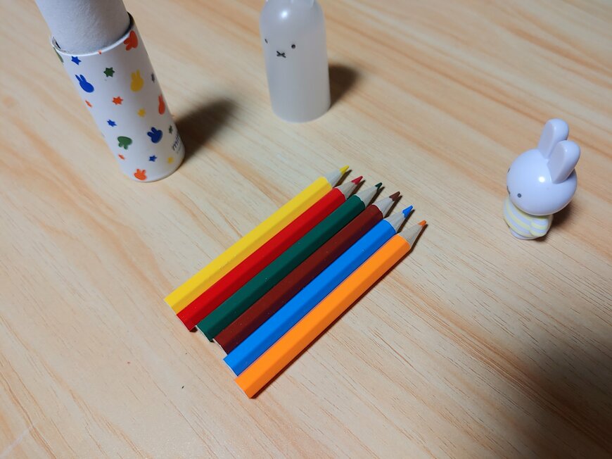 色鉛筆のカラーは、赤・黄色・オレンジ・水色・緑・茶色の6色です。せっかくの6色なのに、ブルーナカラーではないのが若干惜しい!