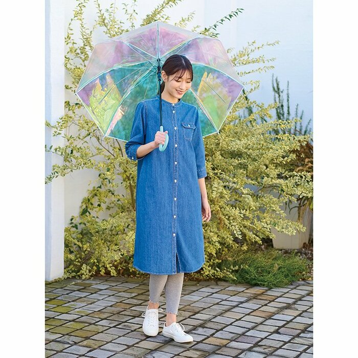 トレンドのきらきら輝くオーロラカラーのビニール傘。開くとさらに可愛い色付きのカラー骨を使用しています。雨の日も楽しくなりそう。