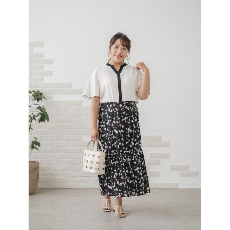 先ほどご紹介した「配色フレアブラウス」と画像のようにコーデしてもかわいいでしょう。お値段は1790円(税込 1969円)です。