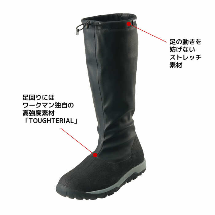 履き口を折り返せる2WAY仕様と、足の動きを妨げないストレッチ素材が特徴です。足回りにはワークマン独自の高強度素材「TOUGHTERIAL(タフテリアル)」を搭載しています。