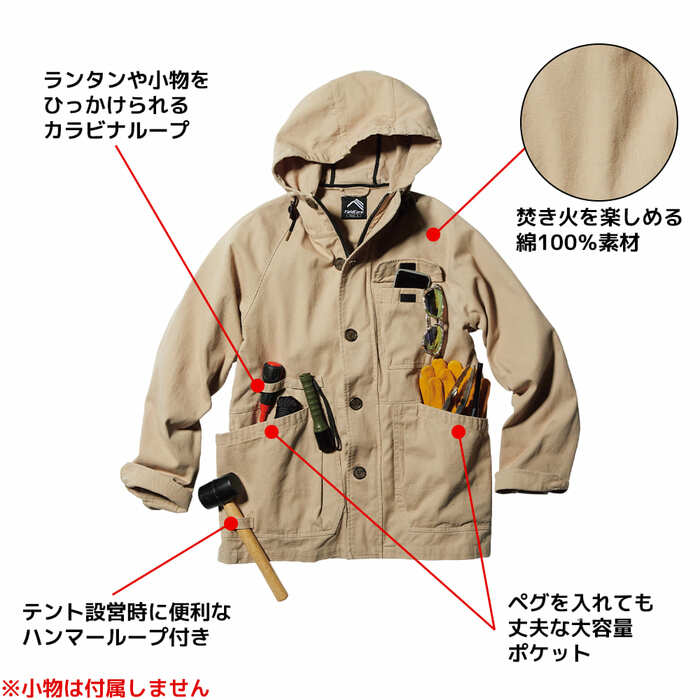 焚き火を楽しむ綿100%のコットンキャンパーです。タフな機能で火の粉や汚れから守ってくれます。新色としてコルクが登場。ペグを入れても丈夫な大容量ポケットが活躍してくれます。